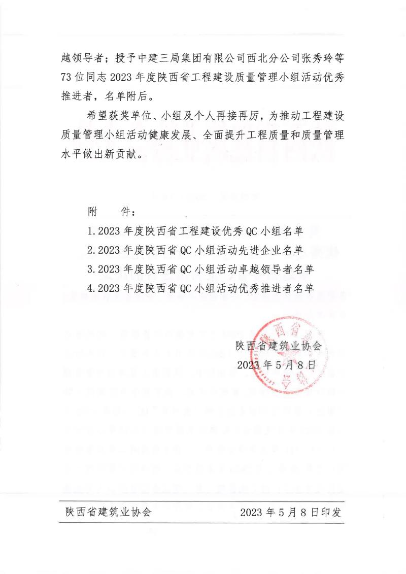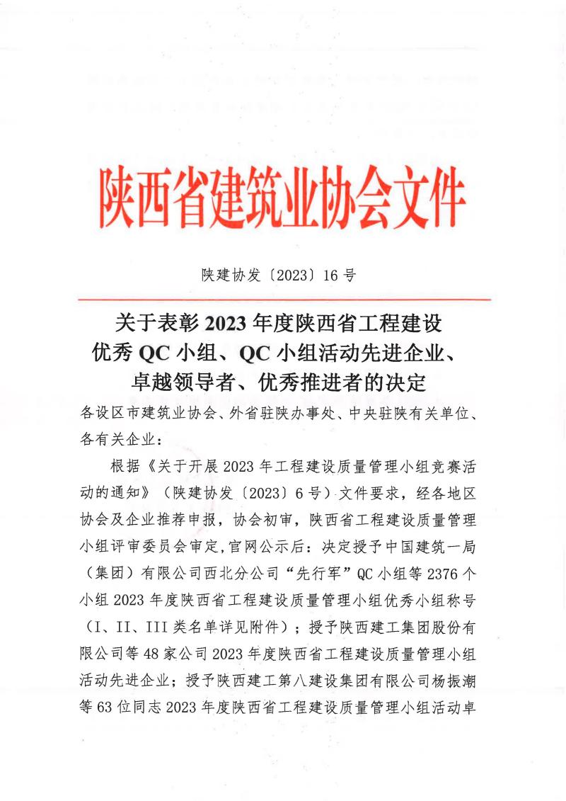 近期,在陜西省建筑業(yè)協(xié)會2023年QC成果評審中,港務(wù)中路項(xiàng)目QC小組《切割機(jī)擋火、降塵、水過濾系統(tǒng)的研制與應(yīng)用》榮獲二類成果獎。今后我們將繼續(xù)努力,再接再厲,爭取拿到更多成果獎項(xiàng),為提升工程質(zhì)量貢獻(xiàn)一份住總力量。