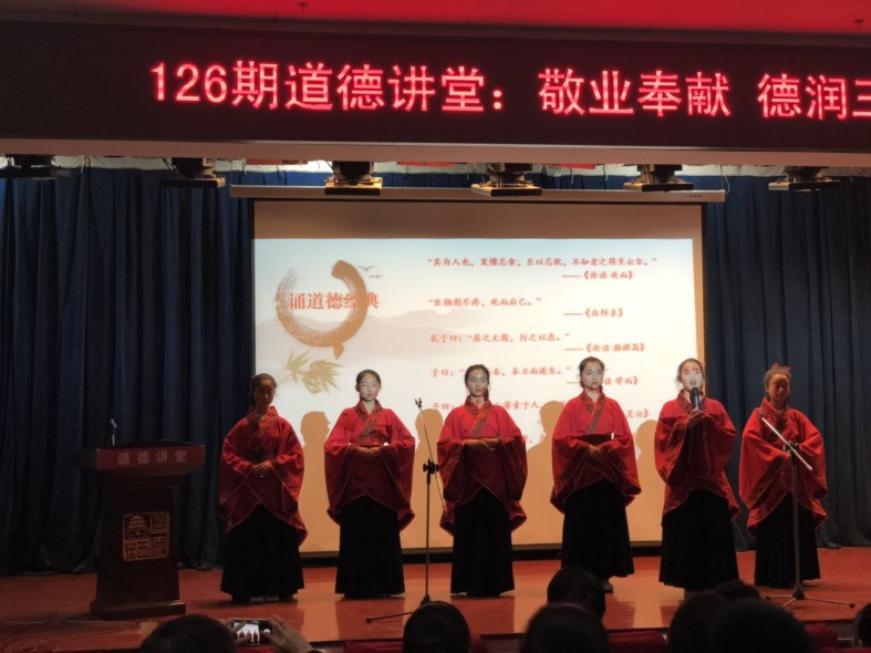 “其為人也,發(fā)憤忘食,樂以忘憂,不知老之將至云爾”,“臣鞠躬盡瘁,死而后已”學(xué)生代表朗誦的道德經(jīng)典也再次說明愛崗敬業(yè)精神從古至今一直為人們所崇尚。
