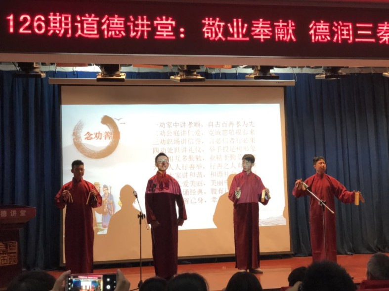 此次講堂共有五個(gè)環(huán)節(jié),圍繞“敬業(yè)奉獻(xiàn),德潤三秦”,這一主題,以唱《公民道德歌》、講道德故事、誦道德經(jīng)典、念勸善詞、做道德承諾等形式開展。每個(gè)環(huán)節(jié)的內(nèi)容都豐富多彩,引人深省,讓大家受益匪淺。